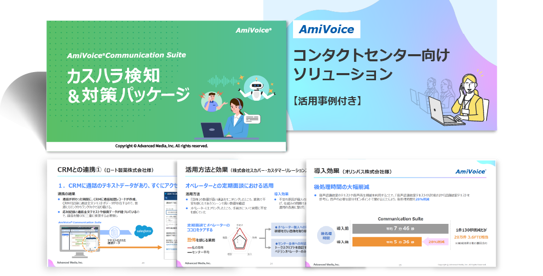 AmiVoice Communication Suiteの6つの機能をカスハラ検知と対策用にカスタマイズし、AOI LLMのカスハラ情報抽出モデルを組み合わせた特別パッケージです。