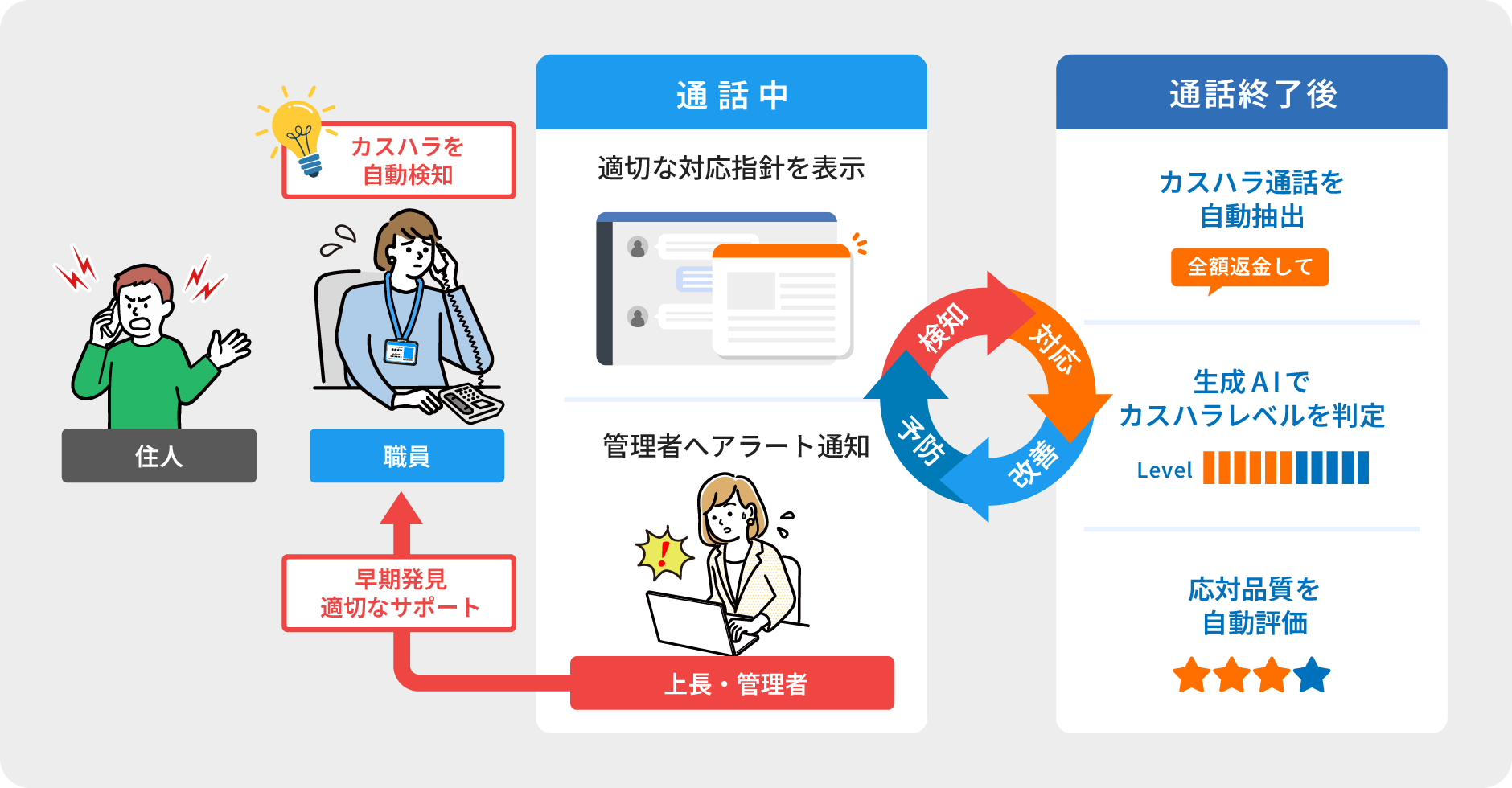 通話中の不適切な発言の検知、職員の心理的サポート、管理者による判断の支援、さらに通話終了後の事後分析を行うなど、電話応対中から通話終了後の後処理までを包括的にサポートします。豊富な導入実績に基づくノウハウを反映し、カスハラの検知・対応・改善・予防のサイクルを確立。さらに、生成AIを活用した分析機能も利用でき、自治体電話応対のおけるさまざまなカスハラ対策ニーズに柔軟に対応します。