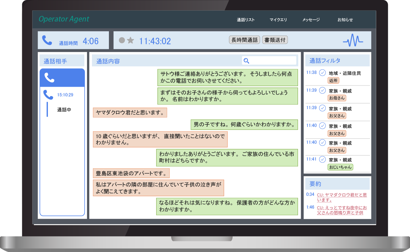 会話は高い精度で文字化されるため、通話中のメモ作成や記録、報告書の作成にかかる時間を大幅に短縮。