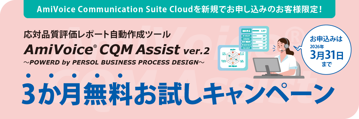 | 提供内容 | コンタクトセンター向け応対品質評価レポート自動作成ツール「AmiVoice CQM Assist」3か月無償 |
