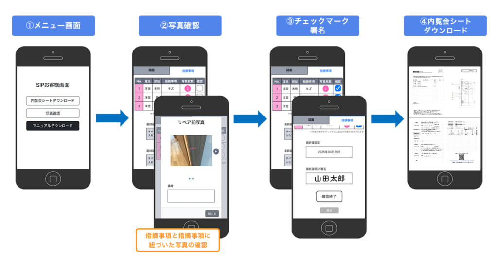 スマホで完結!内覧会シートのダウンロードやリペア後の写真確認が遠隔でも可能に
