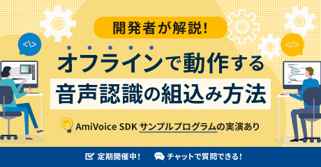 オフラインで使用できる音声認識エンジン「AmiVoice SDK」について開発者視点から特長はもちろん、データエントリーでの音声認識活用事例や、サンプルを使った具体的な音声認識の実行方法まで詳しくご紹介するオンラインセミナーを定期開催しております。