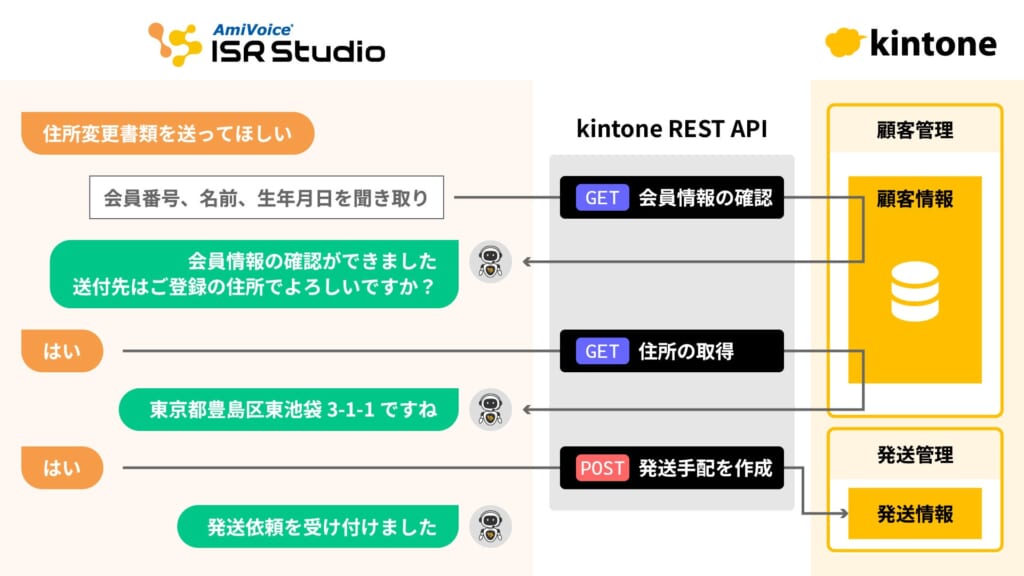本機能により、「kintone」上のデータを活用した高精度かつ高度な電話自動応対が可能となります。「kintone」に登録された顧客情報などを参照し、「会員番号による本人確認」「会員情報を利用したヒアリング」など、データ連携を伴う電話応対の自動化を実現します。また、「kintone」へのデータ登録や更新にも対応しているため、ヒアリングした結果をもとに「予約内容のアップデート」「応対内容の自動登録」などを行うこともできます。