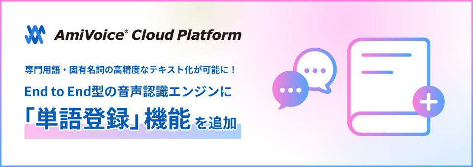 株式会社アドバンスト・メディア(本社:東京都豊島区、代表取締役会長兼社長:鈴木清幸 以下、アドバンスト・メディア)は、開発者向けボイステックプラットフォーム「AmiVoice Cloud Platform(アミボイス クラウド プラットフォーム)」にて提供している、国内シェアNo.1※のAI音声認識AmiVoiceを活用した音声認識API「AmiVoice API(アミボイス エーピーアイ)」で提供しているEnd to End方式の音声認識エンジンに、「単語登録」機能を追加しました。