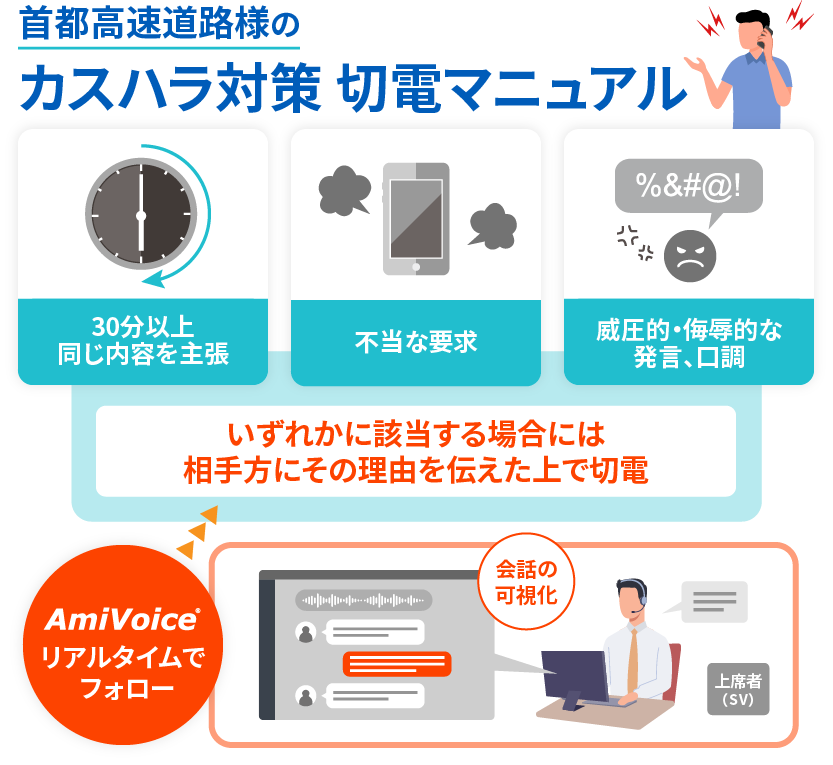 首都高速道路様では、カスハラ対策として、「切電マニュアル(カスハラ対策マニュアル)」を策定し、一定条件下での切電をルール化しています。このマニュアルの運用をサポートする音声認識システム「AmiVoice®Communication Suite」をアルティウスリンク様の提案により導入し、会話の可視化やリアルタイムアラート表示、応対履歴確認が可能になりました。さらに、対応内容が客観的に記録されることで、マニュアル遵守を正しく検証できるようになりました。オペレーターからは「電話応対に前向きになれた」「守ってもらえる安心感は大きい」という声があり、心理的負担が少ない業務環境を実現しました。