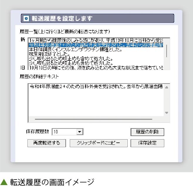 音声入力は昔から使っていたこともあって、すぐに慣れた気がします。ただ、入力した内容を転送する際、入力箇所にカーソルを合わせるのを忘れて、しまった!と思うときがあります。カルテ画面をたくさん開いてると、違う箇所をクリックしちゃうんですよね。そんなときには 転送履歴から文章をクリップボードにコピーして、入力箇所にペーストしています。転送ミスをしても、音声を再度吹き込む必要はないです。